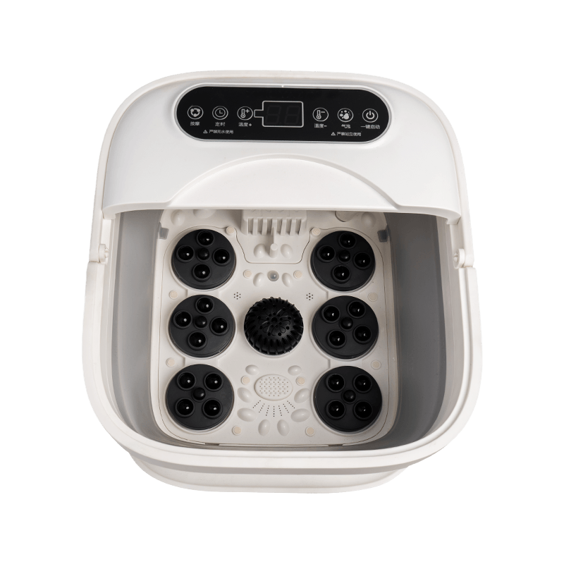 Z-2301 foldable foot bath is available in white and dark blue. It features a 450W heating system and intelligent constant temperature function, which can maintain a stable water temperature, ensuring that your feet can relax at a comfortable temperature for a long time. The product adopts a folding design, which is easy to store and carry, and is suitable for home or dormitory use. It has six sets of Tai Chi roller massage (including one hidden one), kneading and acupressure, and oxygen surfing functions, and the massage mode and water temperature can be adjusted according to personal preference. It is equipped with a computer board touch button and digital display; the rotating hidden medicine bag box design is convenient to use; the colorful atmosphere lights automatically cycle to create a comfortable and relaxing environment. The water and electricity separation and intelligent safety protection design make it safer to use, while combining convenience and high performance.